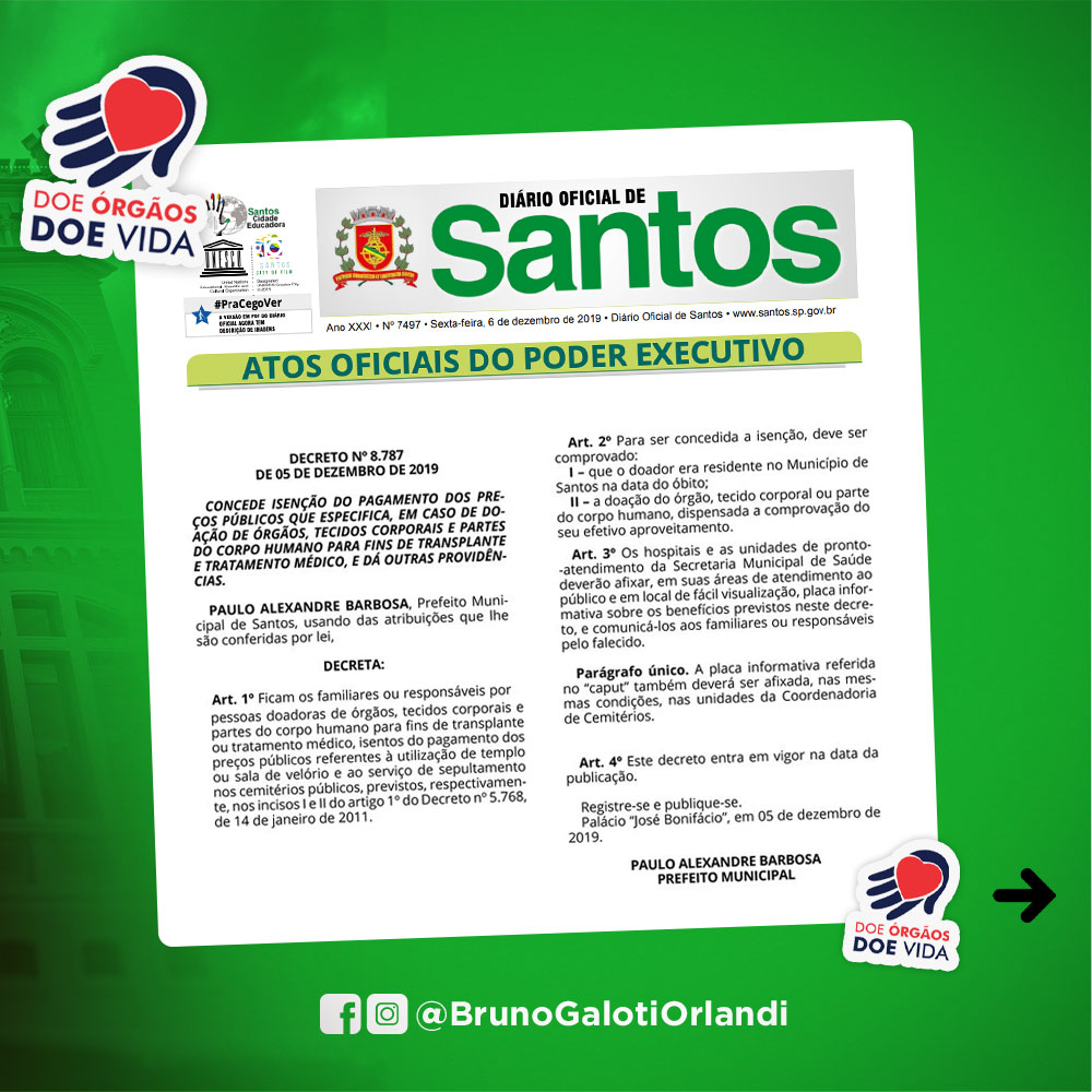 Em nosso mandato, tivemos a oportunidade de trazer o tema para discussão e propor medidas que incentivassem cada vez mais santistas a manifestarem seu apoio à doação de órgãos.