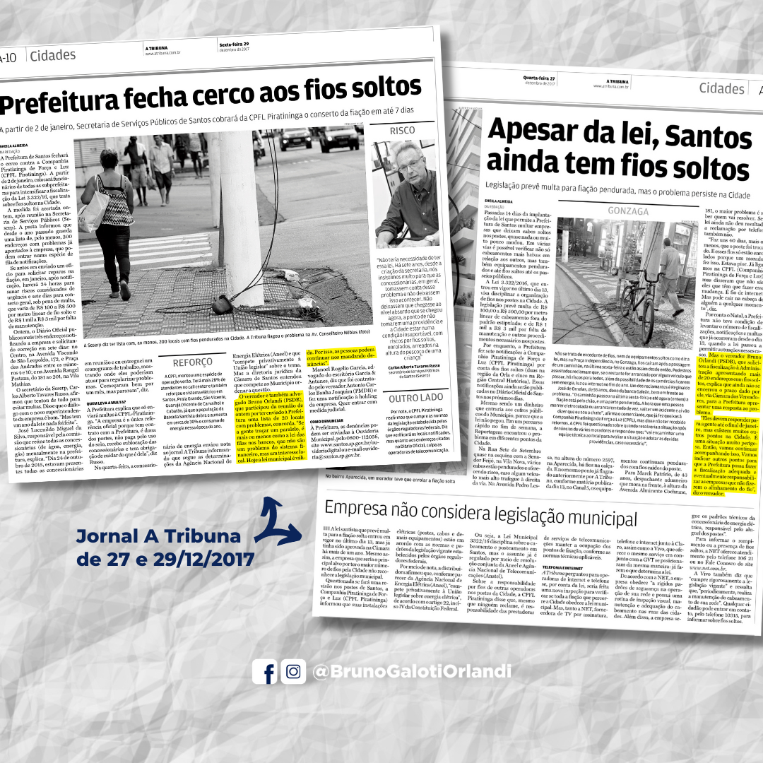 Na 52ª Sessão Ordinária, realizada na última terça-feira (12), na Câmara Municipal de Santos, cobramos providências das concessionárias quanto aos fios e cabeamentos soltos por toda a cidade.