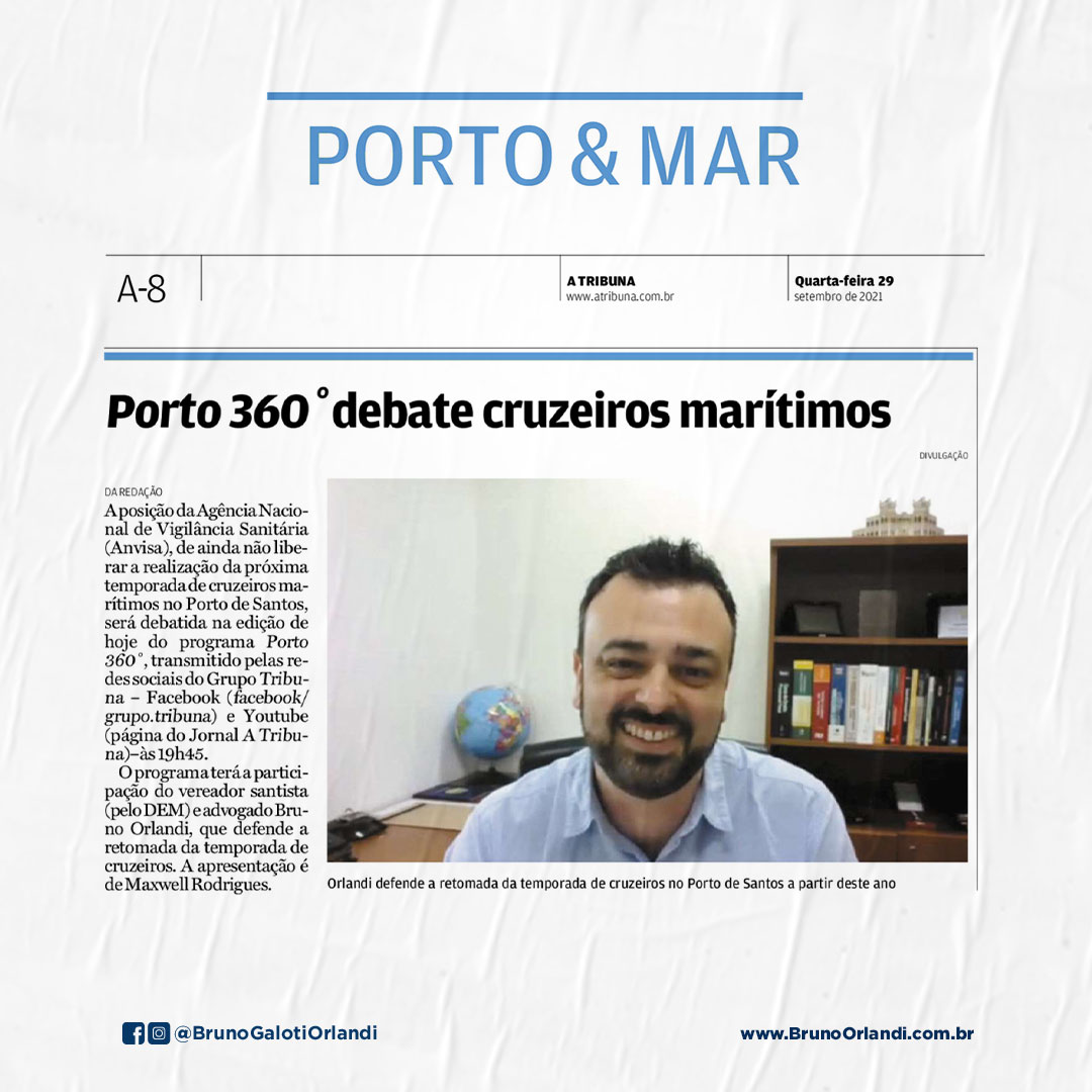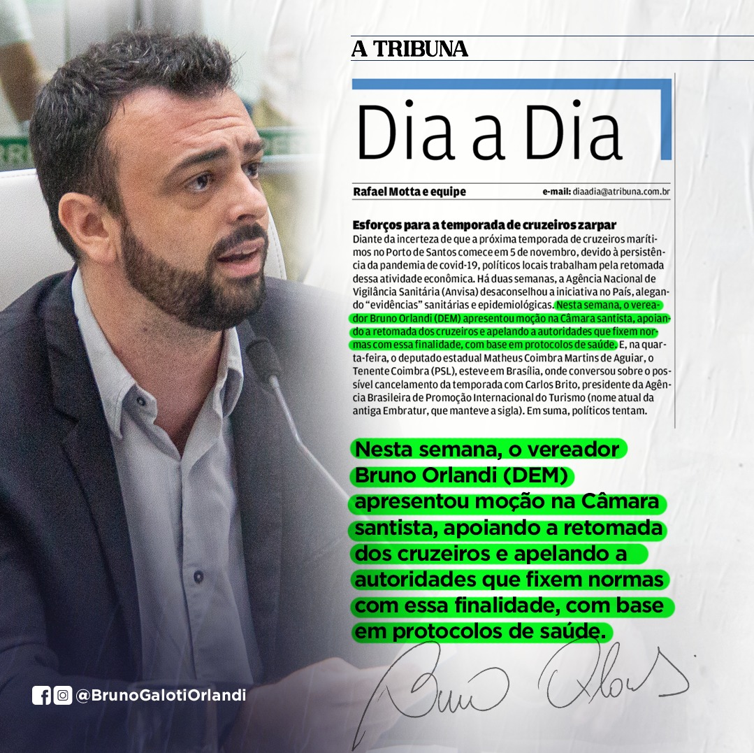 Diante disso, o vereador Bruno Orlandi (DEM) apresentou Moção, durante a 48ª Sessão, da Câmara Municipal de Santos, em apoio à liberação dos cruzeiros marítimos, um dos segmentos mais impactados durante a pandemia.